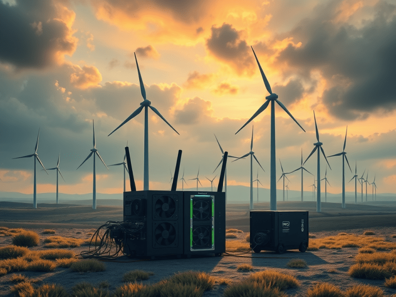 Bron: met WordPress-gegenereerde afbeelding met de (automatische) prompt: “create a featured image depicting a modern wind farm with multiple wind turbines under a dramatic sky, symbolizing crryptocurrency mining in a windmill park. Highlight three mining rigs connected to a router at a wind farm location, and include two Helium nodes subtly integrated into the scene”. (haha)