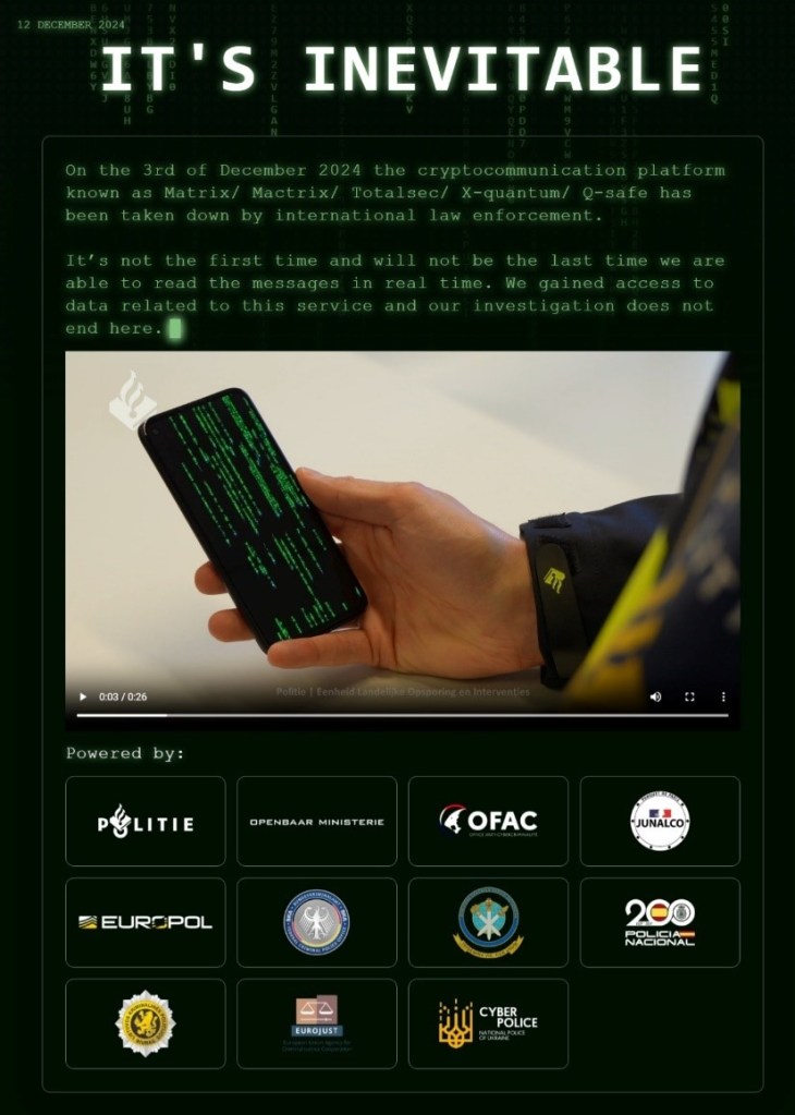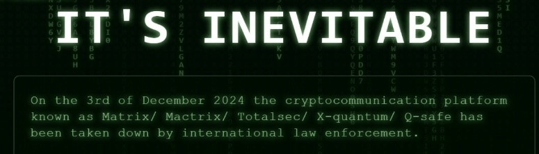 Op 3 december 2024 hebben de Nederlandse en Franse autoriteiten de cryptocommunicatiedienst ‘MATRIX’ ontmanteld. Deze dienst wordt door de politie gezien als de als de opvolger van voorgangers als ANOM, Sky ECC en EncroChat.