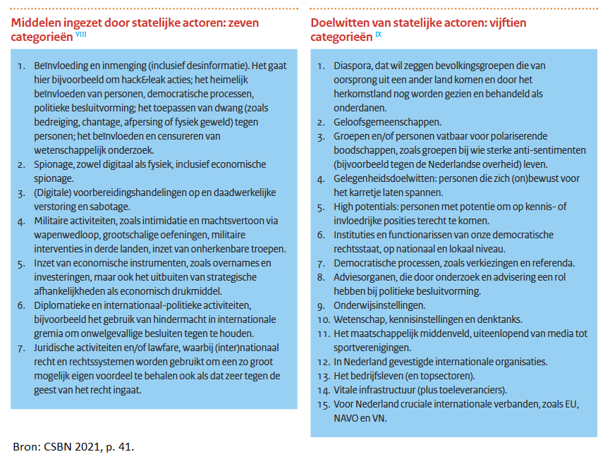 Ten slotte is het dreigingsbeeld in de afgelopen jaren sterk veranderd. Nieuwe cyberdreigingen – wij noemen in onze factsheet desinformatie en cyberspionage – en ondermijnende criminaliteit worden nu door de AIVD opgepakt. Het is echter maar de vraag in hoeverre al deze dreigingen in gelijke mate de nationale veiligheid raken, en daarmee tot het taakgebied van de diensten zijn te rekenen. Het terugkerende punt is dat veel onduidelijkheid bestaat over de rollen en verantwoordelijkheden van de diensten bij deze nieuwe dreigingen.