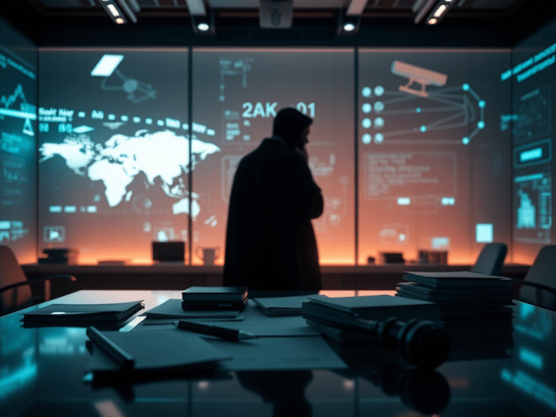 Bron: Afbeelding is AI gegenereerd door WordPress met de (automatische) prompt: “Create a highly detailed and sharp-focused image for a blog post on the role of Dutch authorities in the SkyECC operation, emphasizing the themes of cybercrime and judicial proceedings. The image should feature a digital courtroom setting with a silhouette of a judge, legal documents scattered on a modern desk, and high-tech surveillance elements in the background. Illuminate the scene with soft, dramatic lighting to enhance the seriousness of the subject, reflecting a blend of technology and law. Ensure the image is in high resolution to capture intricate details, making it suitable for a featured blog post.”