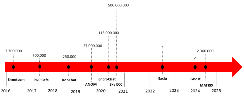 7,5 jaar geleden, in maart 2017, verscheen het eerste persbericht op OM.nl over het veiligstellen van berichten die zijn verstuurd met ‘cryptotelefoons’ (ook wel ‘PGP-telefoons’ genoemd) van Ennetcom met de titel ‘Versleutelde berichten: schat aan criminele informatie‘. Sindsdien zijn er negen cryptcommunicatiediensten ontmanteld en gegevens van deze telefoons (met name de berichten gekoppeld aan de verzenders en ontvangers) zijn veiliggesteld. De gegevens wordt geanalyseerd en gebruikt als bewijs in opsporingsonderzoeken.