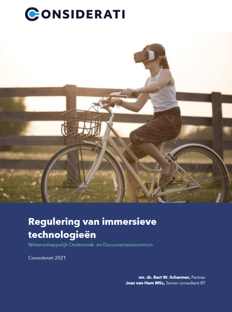 Het tweede onderzoek gaat over de regulering van immersieve technologieën. Immersieve technologieën zijn technologieën die de realiteit aanpassen of een nieuwe realiteit creëren. Het onderzoek bespreekt de twee bekendste vormen van immersieve technologieën: Augmented Reality (AR) en Virtual Reality (VR). Bij AR wordt onze perceptie van de wereld uitgebreid doordat Virtuele elementen worden toegevoegd aan de realiteit, bijvoorbeeld door middel van apparaten zoals AR-brillen of toepassingen zoals Pokémon Go. Bij VR wordt de fysieke wereld zo veel mogelijk vervangen door een kunstmatige of virtuele werkelijkheid, bijvoorbeeld door een VR-bril.